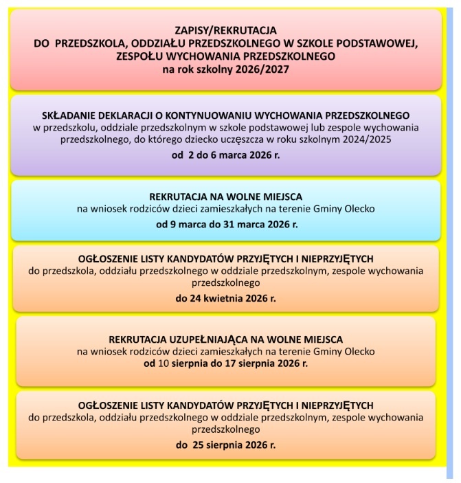 Na rok szkolny 2026/2027 Gmina Olecko oferuje dzieciom 3-6 letnim edukację przedszkolną w Przedszkolu z Oddziałami Integracyjnymi Krasnal w Olecku, oddziałach przedszkolnych zorganizowanych w szkołach podstawowych oraz zespołach wychowania przedszkolnego.